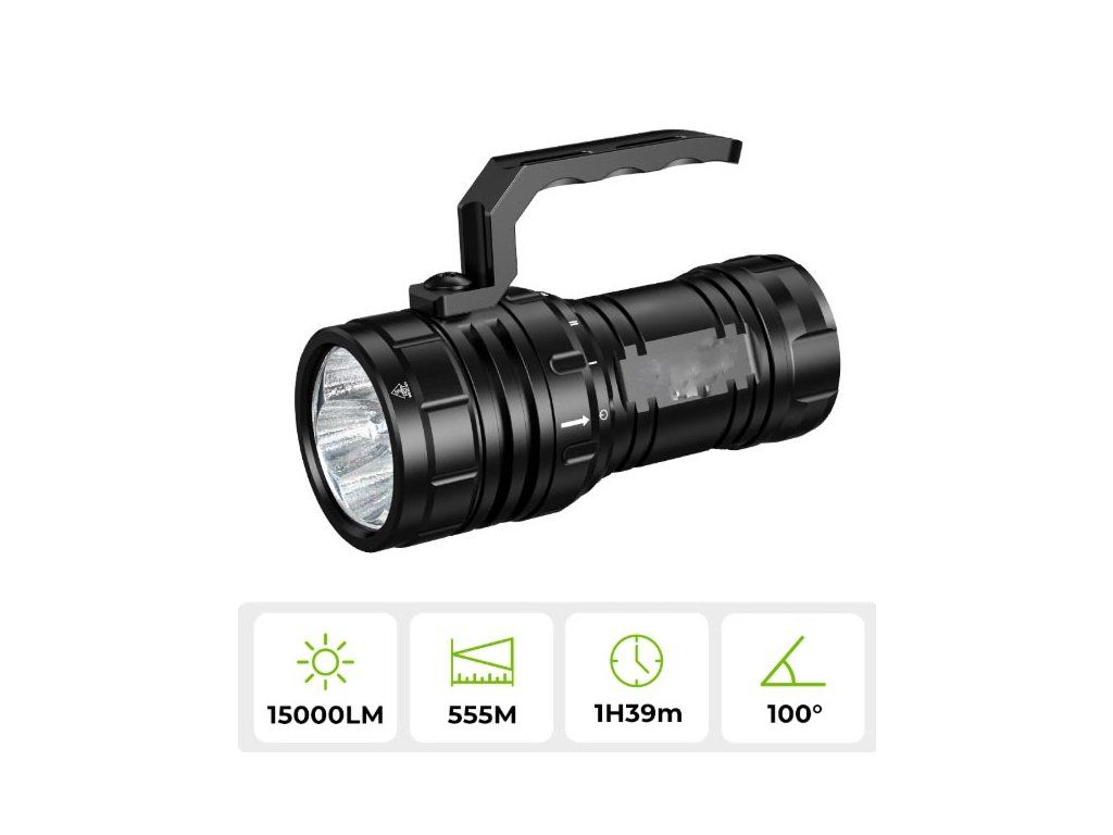 Vybaveno 6× CREE XHP50.2 LED diodami s dosvitem až 555 metrů – ideální pro noční ponory, hloubkové potápění, průzkum jeskyní a pronikání do vraků.